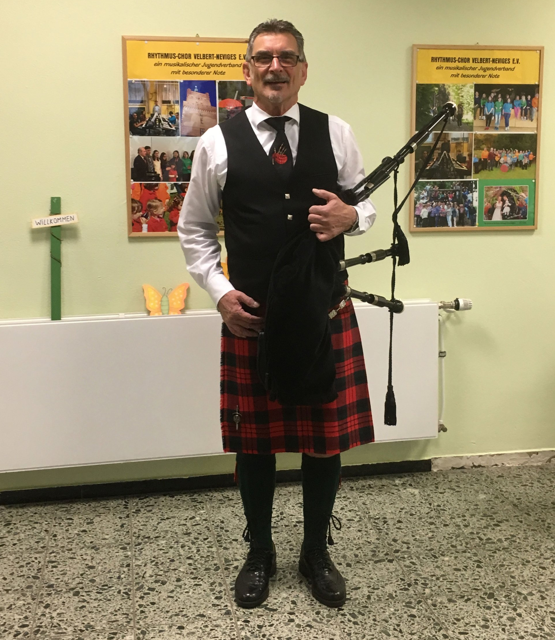 Das Nationalinstrument der Schotten ist beim Rhythmus-Chor ebenfalls zu Hause. Zu unseren Instrumental-Virtuosen gehört also auch ein hervorragender Dudelsack-Spieler.